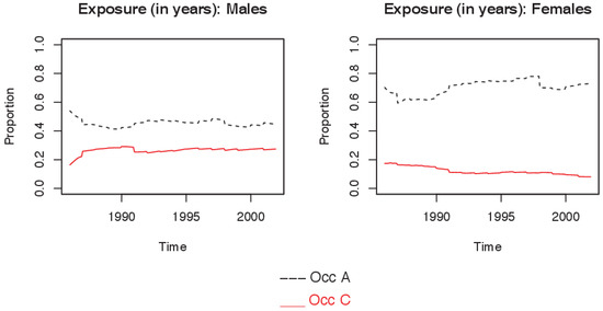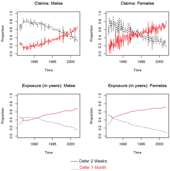 Figure A1 and Figure A2 show the population composition for claims and exposure in selected occupation classes and deferment periods. Figure A1 shows that the proportions of policy holders and claims by occupation class have remained relatively constant for both sexes over the period of observation. In contrast, there have been dramatic changes in the population composition by deferment period, with a substantial increase in the proportion with longer deferment periods (Figure A2).