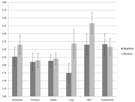 In the present study, priming effects were observed, as participants exposed to negative priming were less likely to take risky decisions (see also [25]). Interestingly, this negative priming effect was confined to simple and non-experiential financial scenarios (i.e., gambling to win or to lose). Compared to financial products such as pension provision or insurance, it can be argued that simple monetary gambles may represent a different (possibly simplified) version of the choices people take for real financial products. A potential explanation of the above difference could be as follows: People may understand (conceptualise) the financial risk differently in each decision-making domain. It is plausible that the respondents’ risky behaviour is informed by aspects of the interface with which they are dealing, rather than underlying decision-making processes. Specifically, it could be argued that people’s experiences of events “leak” into decisions even when risk information is explicitly provided—an integration of experience and description of risks on preferences [5]. A consequence of this view is that people do not have stable underlying preferences for risk; instead, context and experience determine preferences even when the utilities (risk and reward) of alternative options are known [4,5].