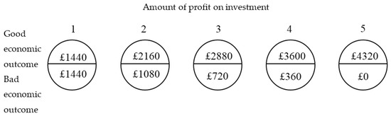Imagine that you are deciding which of five firms to invest in. You can earn an investment profit with all firms, but with some firms your investment profit is more or less risky, which depends on how successful each firm is. It is uncertain whether the success of each firm will be high or low because the success depends on whether the economic and market conditions have been good or bad, respectively. There is a 50/50 chance that the outcome is good or bad for each firm. However, some firms are more affected by the economic conditions than others. You have to indicate in which of the five firms you would prefer to invest. The five firms are displayed below as pie charts. The upper and lower region of each pie chart corresponds to a 50% chance of making the profit written in each region. Imagine that a spinner is attached to the centre of the pie chart. For example, if the imaginary spinner is spun and the pointer lands in the upper region of firm 1, the outcome would be a profit of £1440 for you. If the pointer lands in the lower region, the outcome would also be a profit of £1440. Investing in firm 5 can bring you £4320 if the pointer lands in the upper region or £0 if the pointer lands in the lower region. Please choose in which firm (1 to 5) you’d feel most comfortable investing and circle the corresponding number. Make this decision as you would do if you had to play these gambles for real (see Figure A2).