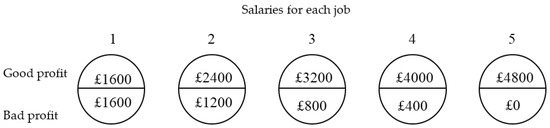 Suppose that you are the only income earner in the family and you are looking for a job at the moment. In this decision task, you have to select one from among five identical jobs offered by different companies which offer different monthly salaries. Each job is paid depending on the profit of its company for each monthly period and can offer you two possible salaries, each occurring with 50% probability (so the salaries are variable). The five salaries (jobs) are displayed below as pie charts. The upper and lower region of each pie chart corresponds to a 50% chance of receiving the salary written in each region. Imagine that a spinner is attached to the centre of the pie chart. For example, if the imaginary spinner is spun and the pointer lands in the upper region of job 1 (the company has a good profit), the outcome would be a salary of £1600. If the pointer lands in the lower region (bad company profit), the outcome would also be a salary of £1600 (therefore, job 1 offers fixed salary). Job 5 offers very variable salary and can bring you £4800 if the pointer lands in the upper region (good company profit) or £0 if the pointer lands in the lower region (bad company profit). Please choose which job (1 to 5) you’d feel most comfortable to start and circle the corresponding number. Make this decision as you would do if you had to take these jobs for real (see Figure A3).