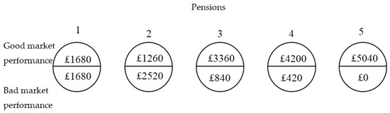 Here you would have to imagine making choices between five different pension plans offering different retirement incomes (pensions) depending on the proportion of your savings you invest in bonds with a fixed interest rate and how much you would invest in company shares, which can be more unpredictable. Investing more in companies’ shares could bring you a higher pension but there is also a chance of getting a low pension or even zero (losing all your savings), because the performance of your investment in shares depends on the performance of the individual companies and the economic conditions. In this decision task, you have to select one from among five pension plans each offering different possible pensions, based on the differing bond versus shares mixture of your investment. Each pension investment plan has two possible outcomes, each occurring with 50% probability. The five pension plans are displayed below as pie charts. The upper and lower region of each pie chart corresponds to a 50% chance of obtaining the pension (per month) written in each region. Imagine that a spinner is attached to the centre of the pie chart. For example, if the imaginary spinner is spun and the pointer lands in the upper region of pension plan 1, which is all invested in bonds, then the outcome would be a monthly pension of £1680. If the pointer lands in the lower region, then the outcome would also be a monthly pension of £1680 (because bonds offer fixed interest rate). Pension plan 5 is all invested in shares and can bring you £5040 per month if the pointer lands in the upper region or £0 if the pointer lands in the lower region. Please choose in which pension plan (1 to 5) you’d feel most comfortable to invest your retirement savings and circle the corresponding number. Make this decision as you would do if you had to make these pension investments for real (see Figure A4).
