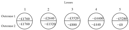 Imagine that you are confronted with a gambling situation, in which you can only lose money rather than gain, or in the best possible case you can break even by not losing. In this decision task, you have to select one from among five gambles. The upper and lower region of each pie chart corresponds to a 50% chance of losing the amount written in each region. Imagine that a spinner is attached to the centre of the pie chart. For example, if the imaginary spinner is spun and the pointer lands in the upper region of gamble 1, the outcome would be a loss of £1760. If the pointer lands in the lower region, the outcome would also be a loss of £1760. Gamble 5 can make you lose either £5280 if the pointer lands in the upper region or £0 if the pointer lands in the lower region. Please choose which gamble (1 to 5) you’d feel most comfortable to play and circle the corresponding number. Make this decision as you would do if you had to play these gambles for real (see Figure A5).