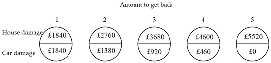 Imagine that you want to insure your new house and a brand new car. The insurance company offers you to choose among five insurance policies, which have the same price (how much you pay for the insurance). There is an equal chance something bad happen to your car or house so a claim on each is equally likely. Some policies are moderately generous in damage to the house and the car. Some policies are more generous for the house, but less for the car. The five insurance products are displayed below as pie charts. The upper and lower regions of each pie chart show the amounts you get back in case your house and car get damaged, respectively. Note that the statistics show that there is an equal chance your house or car to get damaged. You can visualise these hazards by imagining that a spinner is attached to the centre of the pie chart. For example, if the imaginary spinner is spun and the pointer lands in the upper region of insurance 1, the outcome would be a pay of £1840 for your house. If the pointer lands in the lower region, the outcome would be a pay of £1840 for your car. Insurance 5 will pay you £5520 if the pointer lands in the upper region (in case you damage your house) or £0 if the pointer lands in the lower region (in case your car is damaged). Please choose which insurance (1 to 5) you’d feel most comfortable to play and circle the corresponding number (see Figure A6).