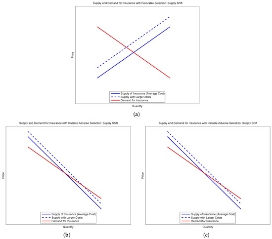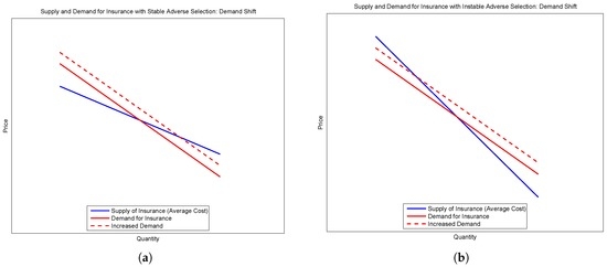 Consider the second and third types. Suppose there is an outward shift of demand without a shift in supply—for example, if agents become more risk averse. When demand starts above supply, the new equilibrium supports more insurance at a lower price. The price falls because the selection is locally adverse. However, when supply begins above demand, the shift in the demand curve leads to less insurance at a higher price. These two cases are demonstrated in the sub-figures of Figure 1.