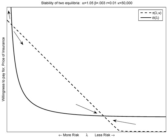 Because the movements in insurance rates and prices are steady, it is unlikely that the equilibria we observe is unstable. Figure 3 demonstrates that the equilibrium with more insurance is the stable of the two. Parameter values that lead to a single equilibrium lead to unstable equilibria.