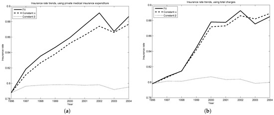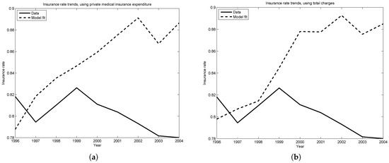 Figure 4a,b plot the insurance rate predicted by the model against the rate observed in the data. The two trends are within four percentage points of one another until 2001, the year of significant tax reform legislation. Since this tax reform decreased the marginal tax rates faced by households, this may explain why the model predicts increasing insurance rates, while the data finds insurance rates dropping slightly since 2000.