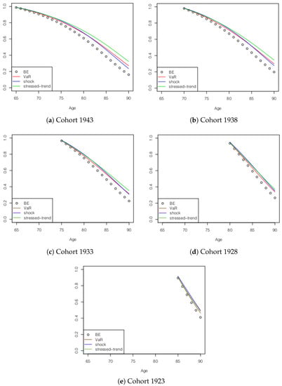 , implied in the calculation for five cohorts (aged 65, 70, 75, 80, 85 in year 2008). For example, if we consider the cohort born in 1933, we can observe that the five-year survival probability under the shock approach is higher than the corresponding survival probability calculated using VaR and stress-trend approaches. This causes a higher