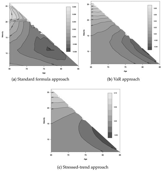 Figure 6. It helps to identify the difference between the risk-neutral probabilities by age (vertical lines) and maturity (horizontal lines) with light grey areas indicating positive values, while dark grey areas show negative values. In all of the graphs of