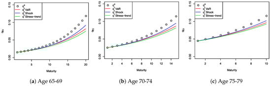 Note that under the stressed-trend approach, the mortality model is given by , where is the mortality rate from the central projection and is the volatility arising from the uncertainty originating from the ARIMA parameters estimate.