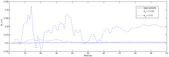 Figure 7 shows that the more government action minimizes the utility of the individuals, the lower the instantaneous forward rate. This result agrees with Figure 1, where the price path was complementary opposite to the one observed here (i.e., the volatility of the zero coupon bond price increased as the government acted maliciously). As a consequence, the forward instantaneous rate—derived substantially from the volatility of the price of the zero coupon bond—shows an opposite trend compared to the one seen for the price.