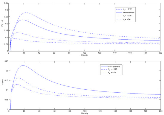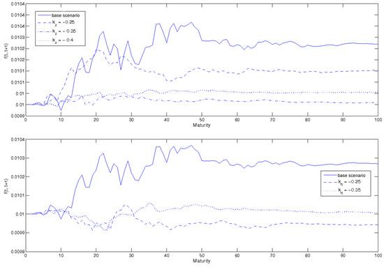 The charts in Figure 12 show opposite paths of the forward instantaneous rate with increasing (absolute value) k parameters. This misleading behaviour is due—once again—to opposite effects summing up in one expression, i.e., the zcb price volatility. In more detail, the ambiguous effect of the k parameters help us to explain this unclear path.
