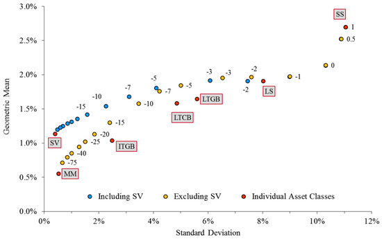 When discussing summary statistics for our net quarterly return data in Table 1, we observed that, over the period of our study from October 1988 through December 2015, SV returns exhibited both a higher mean and lower volatility than either money market or intermediate-term government bond returns. This feature can be seen in Figure 3 below, where we plot two efficient frontiers, one including all seven asset classes in our study and one that excludes SV funds.