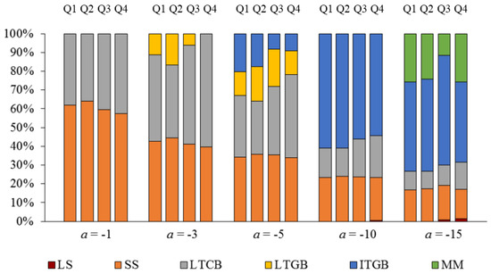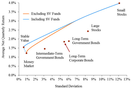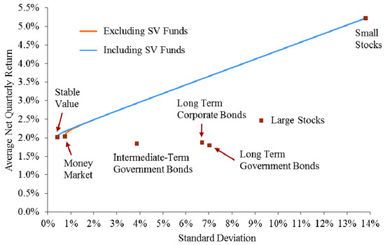 In this section, the question of interest is what would be the (geometric) average quarterly return and volatility for a portfolio that is optimally rebalanced every quarter between 1993 and 2015, according to the rules set out above. We provide answers to this question for selected values of the risk aversion coefficient a in expression (6) above and for portfolios excluding and including stable value. Table 7 shows mean quarterly returns and standard deviations for each of these cases and Figure 4 illustrates the same results in the mean-standard deviation plane. The risk aversion values of a range from +1 to −75, the same range employed by Grauer and Hakansson in their seminal papers. Also, research by Malloy et al. (2009) supports high degrees of risk aversion.