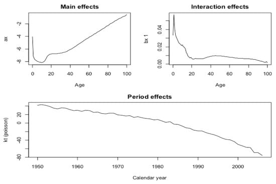 We chose to describe the annual mortality rates by means of the Poisson log-bilinear Lee–Carter Model () and project the mortality indexes of the model by an ARIMA process. According to (), the basic Lee–Carter model, as in (), is not well suited to the construction of projected lifetables. Moreover, Alho observes that, due to the smaller absolute number of deaths at older ages, the logarithm of the observed force of mortality is much more variable at older ages than at younger ones. Considering also that the number of deaths is a counting random variable, according to (), the Poisson assumption appears to be plausible. In order to circumvent the problems associated with the Ordinary Least Square (PLS) method, we can write (cf. ):