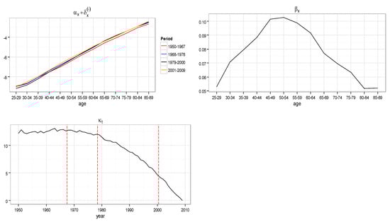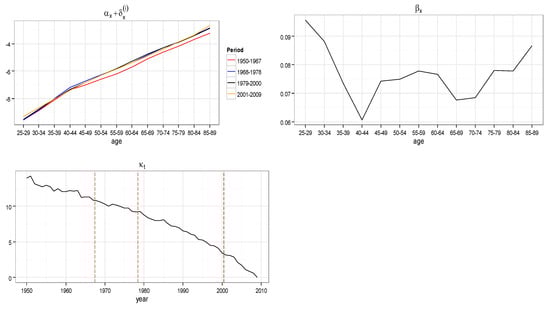 The parameters , and of model (20) are illustrated in Figure 2: their estimated values and the forecasted values for males and females are reported in the Appendix A (Table A1 and Table A2). Moving clockwise in Figure 2, the first subplot shows the trend of the sum of the two parameters and . The second subplot shows the trend of the parameter as function of , and the third reports the adjusted trend as a function of . The three vertical red segments point out the reclassification times: as is evident, no more jumps are present in the graph.