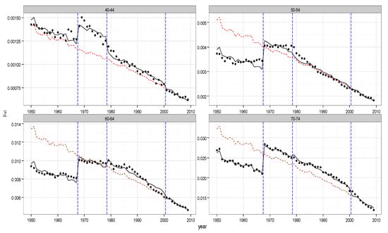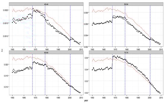 In Figure 2, we show in an orderly way the model parameters and the adjusted mortality rates for males and females in the UK population and cancer and circulatory system illness case. Moving clockwise, in Figure 2 the first subplot shows the trend of the sum of the two parameters and . Being constant with respect to over the whole observed period, the four curves refer to the four different values of obtained in the four intervals: 1950–1967, 1968–1978, 1979–2000, and 2001–2009. These intervals have been pointed in the ICD years (1968, 1979, 2001). The second subplot shows the trend of the parameter as a function of , and the third reports the adjusted trend as a function of . The three vertical red segments point out the reclassification times: as evident, no more jumps are present in the graph. The four subplots in Figure 3 show the adjusted mortality index trends, and in particular show how the discontinuities have been mitigated. As an example, they refer to four different age intervals (40–44, 50–54, 60–64, 70–74): the red dots are the adjusted values of , the black dots are the observed data, and the continuous line represents the fitted data. The plots in Figure 4 and Figure 5 show the same quantities in the case of the female population.