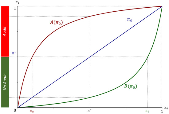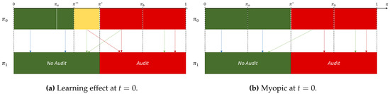 Figure 2b,c illustrate the extreme case where the audit is, respectively, totally informative (