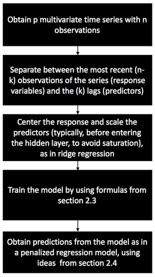 As described in the previous section, an additional layer of transformed predictors is added to , in order to capture the potentially non-linear interactions between the predictors and the output variable. Adding the transformed predictors to the original ones leads to a new matrix of predictors with dimensions , where L is the number of nodes in the hidden layer. We are then looking for simultaneous predictions