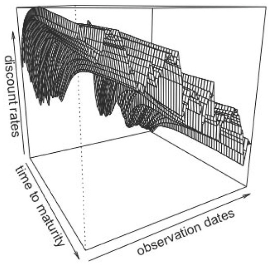 In Figure 2, we present the data that we use, and Table 1 contains a summary of these data; the minimum, maximum, median, first and third quartiles of the discount rates observed at given maturities. There are alternate cycles of increases and decreases of the discount rates, with a generally decreasing trend. Some of the discount rates, at the most recent dates, and lower maturities, are negative.