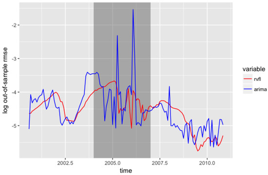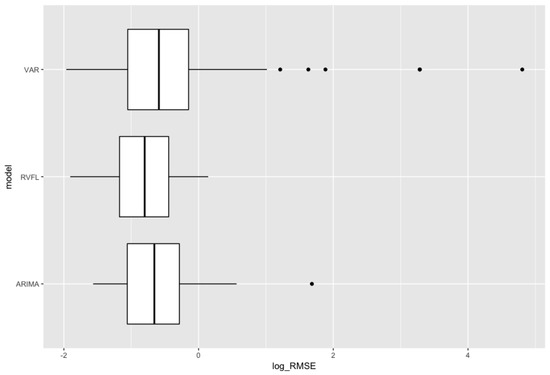 Comparison of 12 months ahead out-of-sample (log(Root Mean Squared Error)), for the ARIMA(AutoRegressive Integrated Moving Average), RVFL, and VAR (Vector AutoRegressive).