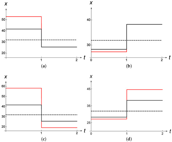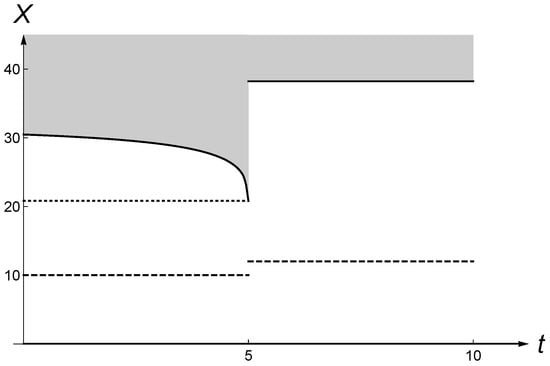 In the model with , the cost of investment decreases at the random time τ. Potential economic applications include cases where regulations such as investment tax credits, foreign investment subsidies and preferential tax treatments matter. Countries seeking to boost employment opportunities and promote growth are often led to consider those policies in order to attract potential employers. Cities use similar incentive packages to enhance their attractiveness for new investments (e.g., the competition for Amazon’s second headquarters). In such situations, firms may be led to decide whether to invest now or wait until a potential new beneficial policy is implemented.