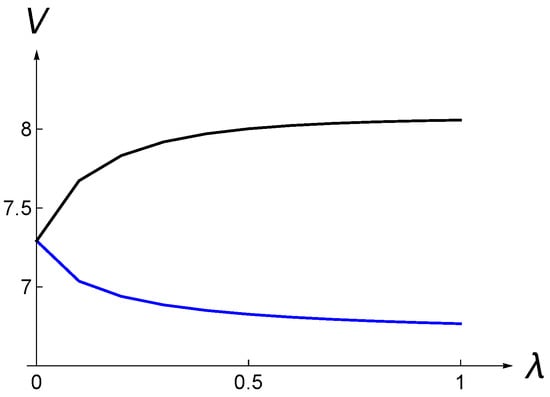 The value function V w.r.t. λ. The parameter set is , , , , , , . We plot the value function for (black upper line) and (blue lower line).