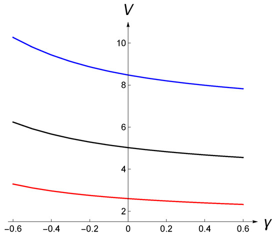 The value function V w.r.t. γ. The parameter set is , , , , , . We plot the value function for (red line), (black line), (blue line).