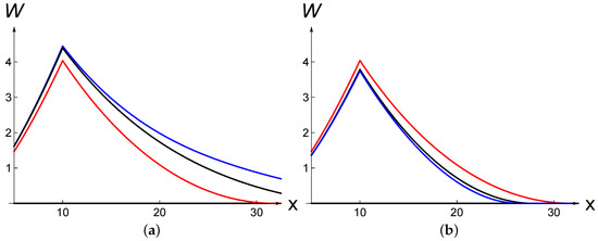 The value of waiting w.r.t. x for different values of λ. The parameter set is , , , , . (a) left: (red line), (black line), (blue line) when ; (b) right: (red line), (black line), (blue line) when .