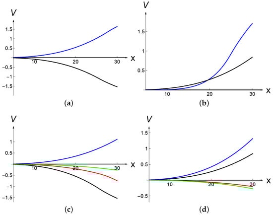 The values of delayed jump premium (DJP) and early investment premium (EIP) and their components w.r.t. x. The parameter set is , , , , , . (a) upper-left: the value of DJP when (blue) and (black); (b) upper-right: the value of EIP when (blue) and (black); (c) lower-left: components of DJP (black line) when : the net benefit (blue line) collected by optimally investing prior to the jump, the net cost (red line) incurred by foregoing optimal investment at and the expected jump cost (green line) associated with investment at the higher ; (d) lower-right: components of EIP (black line) when — instantaneous dividends collected (blue), interest loss on the strike (red), loss associated with expected jump in the strike (green).