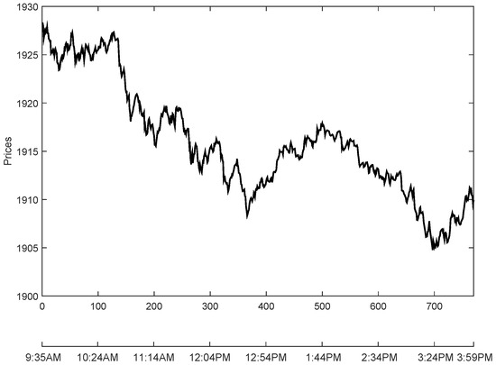 For the sake of clarity, we first exemplify our forecasting methodology and calibration procedure for one randomly chosen day of the S&P 500 index (7 August 2014), keeping in mind that we performed the same analysis on all the remaining time series all for the other days. The day was chosen at random and has no special significance. It appeared to be an “ordinary” trading day. Figure 1 illustrates the behaviors of the price during this particular day.