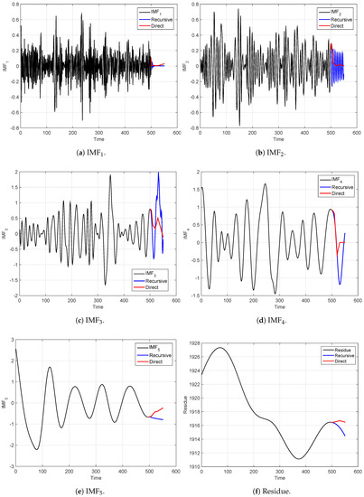 In Figure 2, we compare the forecasted IMFs using the recursive and the direct strategies. Figure 2a illustrates the results of the first IMF. Figure 2b illustrates forecasting results for the second IMF, and so on, until Figure 2f, which shows the forecasted residue. The black line in each plot represents the input IMF, the blue line represents the recursive-strategy forecasting and the red line is the direct-strategy forecasting. We observe that both strategies captured some of the oscillating patterns of the IMFs.