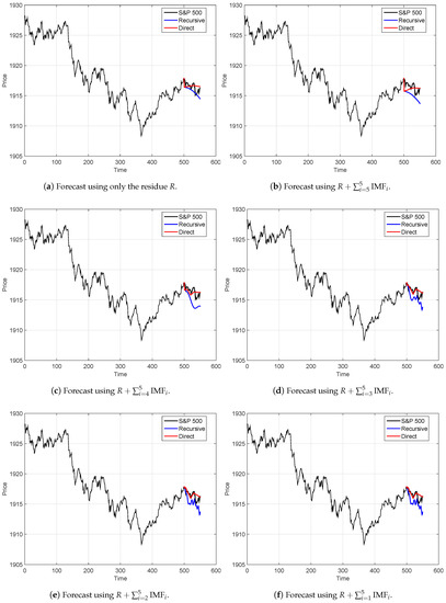 True and forecasted values for the S&P 500 index for 7 August 2014 shown in Figure 1. Forecasted values were obtained using partial reconstructions of the univariate empirical mode decomposition–support vector regression (EMD–SVR) model (Equations (5)–(8)), both the recursive (blue line) and the direct (red line) strategies. We note that the EMD was performed on the training set only (i.e., using only data before beginning of forecasting).