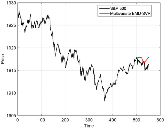 A forecasting example of the multivariate EMD–SVR models for 7 August 2014 is reported in Figure 4. The black line represents the S&P 500 index values, whereas the red line represents the forecasted values from to steps ahead.