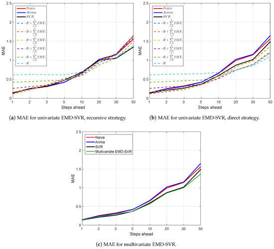 To estimate the performance of the proposed models at each forecast horizon , we calculated the mean absolute error (MAE) (see Section 4.7, Equation (10)) over the time series. The proposed EMD–SVR models are compared with other commonly used benchmark models, which were applied to the initial time series (without the EMD). These benchmark models were the following: