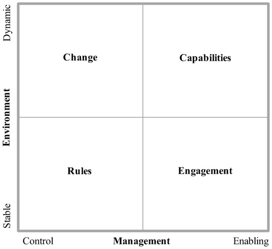 This approach offers certain advantages. First, as discussed, a stable or dynamic environment and controlling or enabling management provides distinct metrics upon which managerial control approaches can be categorized. As shown in this study, approximately half of the companies analyzed have a controlling mode and the other half an enabling mode installed. Second, once categorized, businesses can be analyzed for differences in their management style. While many firms (20% in our sample) sees themselves as still functioning in a rules-based mode, the same amount of firms (20%) place themselves in the engagement-based category. Most of the assessed organizations (35%) believe that they work in a change mode, therefore 25% are in a capabilities-based setting.