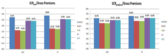 Figure 2 reports instead the Solvency Capital Requirement (SCR) ratios (SCR divided by initial gross premiums) considering either only premium risk or both premium and reserve risk. Capital requirements have been derived using only a market-wide approach, by testing alternative formulae for the non-proportional factor and by considering both and versions proposed by QIS5 and DA, respectively (see Equations (3) and (8)).When reinsurance is not considered, the premium risk capital charge is equal to 27% of premiums under the lognormal assumption and to 29% with the DA approach. Also taking into account reserve risk, we observe ratios of 61% and 66%. It is emphasized how lower volatilities lead to higher differences between the two approaches. The gross is indeed equal to 7.6% when both the premium and reserve are considered, while it is equal to 9% when only premium risk is present.