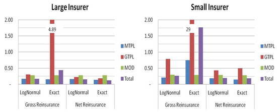 Finally, in order to test the lognormal assumption of the net total losses, we analyze the skewness of this r.v. To this end, we compare the skewness of the lognormal distribution to the exact distribution provided by Equation (13). Furthermore, to evaluate the skewness of the total portfolio, the dependence is described by a Gaussian copula calibrated through the standard formula correlation matrix. The comparison regards both the insurer, whose characteristics are reported in Table 1, and a smaller insurer, whose portfolio is 1/10 of the larger portfolio. Figure 7 shows how the lognormal assumption tends to underestimate real skewness for small portfolios or highly volatile businesses (such as GTPL). However, for both companies, this assumption seems consistent when we analyze the net of the reinsurance distribution.