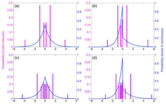 Comparison between the continuous and discrete-approximation density functions, for these two cases (), for , are illustrated in Figure 1. In Figure 1a,b, two discrete values occur below the 33.3rd percentile and above the 66.7th percentile of the respective continuous distributions. For Figure 1c,d, the percentiles are the 20th, 80th respectively. Thus, the most extreme values for the case are more extreme than those for the case (consistent with the earlier statements about ), but they have lower weight.