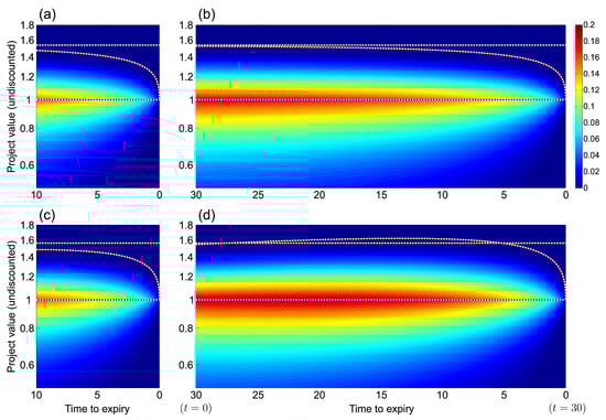 In the first instance, we set , so that there is no jump-diffusion component to the project price movements. Figure 2 shows the difference between the cases where and . The vertical axis represents the undiscounted project value, , plotted on a logarithmic scale. The horizontal axis is shown on a reverse scale indicating time to expiry. Thus, actual time t runs from left to right, beginning at . This is explicitly indicated in Figure 2d.