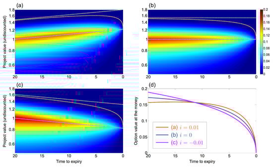 In the case (lower row of Figure 2), once again, the red curve lies strictly below the green line at time , representing the greater value of an option with a longer time to expiry. However, in this case, specifically in Figure 2d, the decision threshold (red curve) is not necessarily decreasing over the lifetime of the option. This surprising effect is due to the fact that the option-contract-specific inflation rate, , is lower than the investor’s implied inflation rate, i. Thus, for large values of t, the option-holder is less risk-averse with respect to monetary values equal to the strike price, so is more likely to delay exercising the option. Just as the exercise threshold increases over the life of the option, similarly, the option value at the money increases prior to decreasing to zero at expiry.