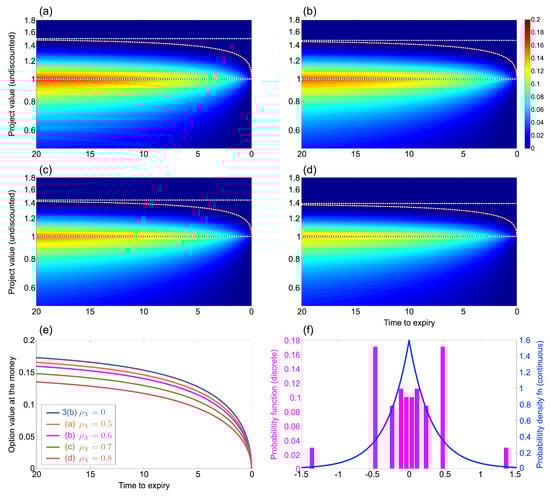 Process as in Figure 3b, but incorporating jump diffusion with parameters . The parameter is, sequentially: (a) 0.5; (b) 0.6; (c) 0.7; (d) 0.8. Sub-figure (e) Plot of undiscounted option value at the money, versus time to expiry, for the four cases represented in (a–d). Sub-figure (f) Continuous and discrete (incorporating rounding of the values) approximations of the random variable , for the case . Exercise threshold at : (a) 1.4736; (b) 1.4483; (c) 1.4105; (d) 1.3563. Option value at the money (): (a) 0.1653; (b) 0.1588 (c) 0.1490; (d) 0.1348. Calculation times (backwards induction step): (a) 4.07 s (1.3×); (b) 4.48 s (1.4×) ; (c) 4.98 s (1.6×); (d) 6.14 s (1.9×), where the figures in parentheses represent a multiple of the case of Figure 3b.