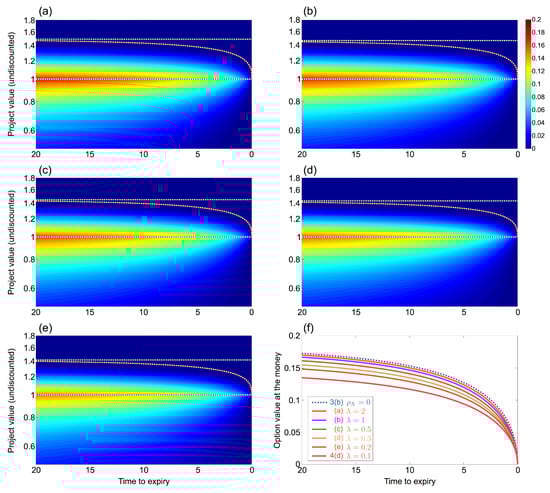 As in Figure 4d, but with jump rates equal to: (a) 2; (b) 1; (c) 0.5; (d) 0.3; (e) 0.2. (f) Plot of undiscounted option valuen at the money, versus time to expiry, for the five cases represented in (a–e). Exercise threshold at : (a) 1.4664; (b) 1.4481; (c) 1.4272; (d) 1.4075; (e) 1.3902. Option value at the money (): (a) 0.1700; (b) 0.1668 (c) 0.1613; (d) 0.1548; (e) 0.1484. Calculation times (backwards induction step): (a) 4.37 s (1.4×); (b) 4.52 s (1.4×) ; (c) 4.84 s (1.5×); (d) 5.06 s (1.6×); (e) 5.46 s (1.7×), where the figures in parentheses represent a multiple of the case of Figure 3b.