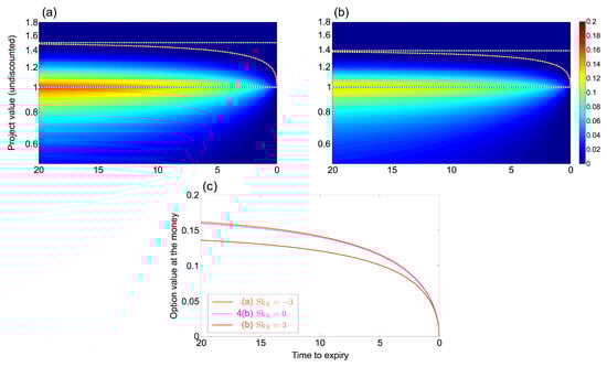 We used the values , 0 and 3, corresponding to and 3.73 respectively. In Figure 6c, we see that the largest at-the-money option value occurs when (that is, 0.1614), with value falling to 0.1588 for zero skewness, and much further to 0.1359 for skewness +3. The asymmetry of this effect (about zero skewness) is due to the different characteristics of the upside and downside risks associated with jumps in the positive- and negative-skewness cases, noting that the value of an option lies in its ability to eliminate downside risk. Specifically, in the positive-skewness case, most jumps are downwards and small in magnitude, with a few being upwards and large in magnitude. However, these directions are reversed in the negative-skewness case. (We emphasise again that all effects must be understood in the context that drift and volatility are held constant in the project-value process.) In Section 5.3.4, we will see that the effect of increasing rapidly mitigates the limited-downside-risk issue associated with the positive-skewness case.
