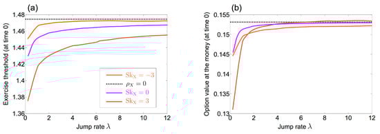 Plots of exercise threshold (a) and option value (b) at time , vs. jump rate , for different values of skewness (−3, 0, 3). Other parameters are given in the text. In particular, . The comparison level when is indicated using a black dotted line.