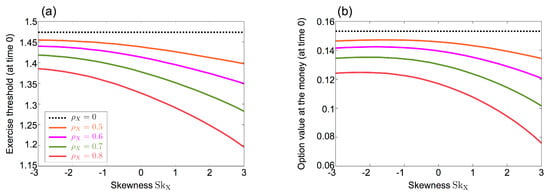 Plots of exercise threshold (a) and option value (b) at time , vs. skewness , for different values of (0, 0.5, 0.6, 0.7, 0.8). Other parameters are given in the text. In particular, .