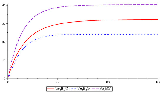 Figure 1 plots the variances of and , given for The variances all increase with time t. The variance of is bigger than those of and for a fixed t. When time t goes to the three variances converge.
