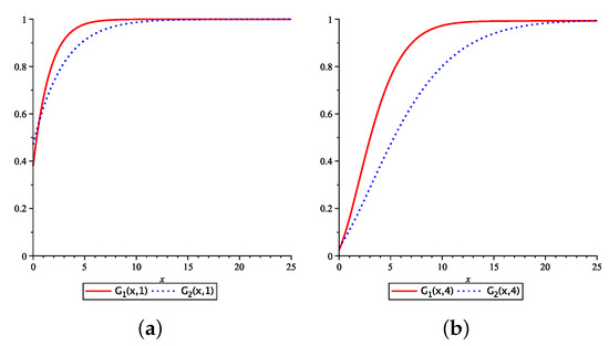 Finally, we display in Figure 2 the numerical values of the distribution function of with initial state i, , for and 4, , and . Note that satisfies the partial differential Equation (25); its solution can be obtained numerically. From the graph, it shows clearly that the probability of being bigger than a fixed x is smaller for small values of t as expected. For most x values, is bigger than due to the fact that the underlying Markov process in our example tends to stay in state 1 more often than staying at state 2.