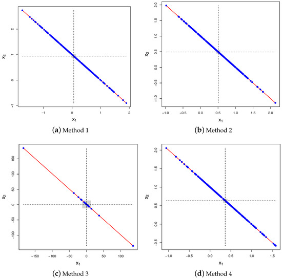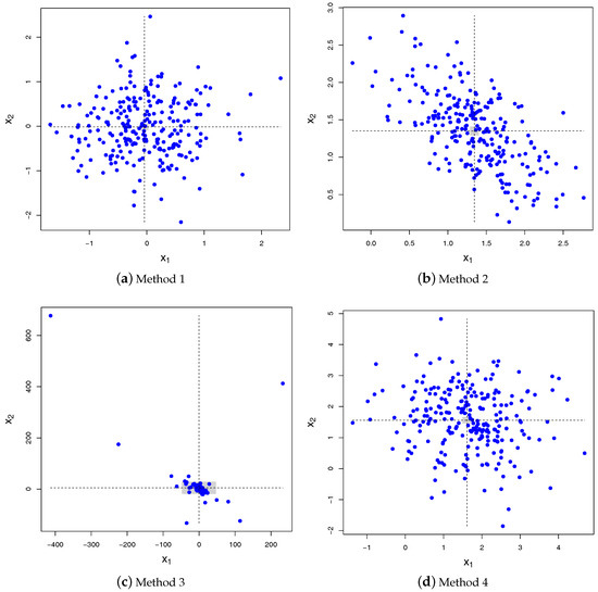Scatter plot of 250 samples drawn for the four methods with , , and . Method 4 yields the correct answer. Only the first two components of the vector are shown to enhance readability; the third component is set to . The vertical and horizontal dashed lines show the empirical means of and for that specific run, respectively. The horizontal and vertical widths of the gray rectangles show the confidence intervals () for both and based on 100 runs of 250 pairs each.