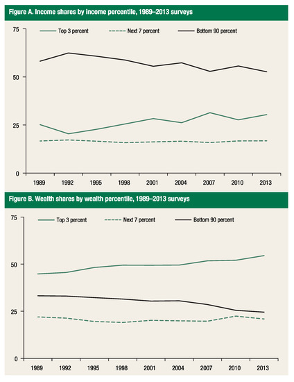 For 2013–2016 SCF, the income and wealth percentiles for the bottom group remain at 90%, but the top 10% are split at the top 1% and next 9%, which suggests more concentration of wealth on the top 1%. Only the wealth share of the top 1% has increased. The wealth share of the next 9% decreased slightly and that of the bottom 90% has dropped below 25%.