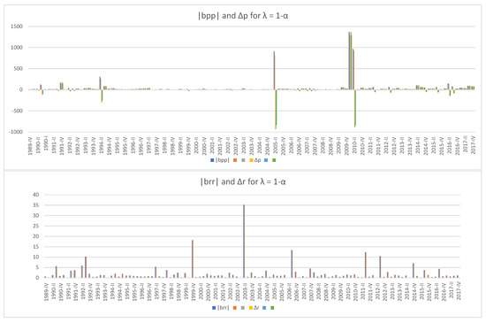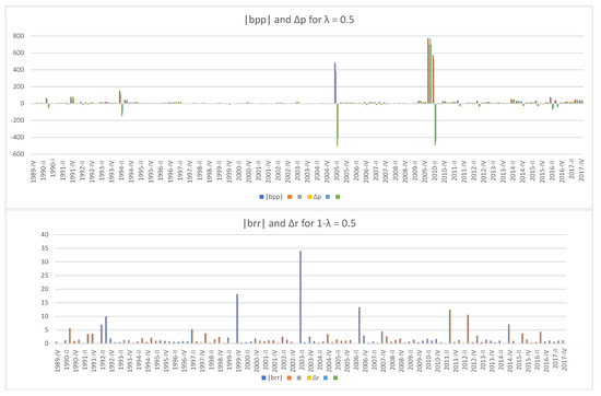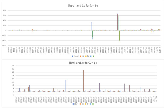 The wealth and income share and are chosen to suit the 2013–2016 Survey of Consumer Finances, yet the debt share is not readily available, at least to the author’s knowledge. Hence we consider five cases: , , , , and . The last case simulates, in the spirit of Kumhof and Rancière (2010), the scenario in which the poor accumulate debt because their income and wealth do not cover the cost of living. Below are the market instability indicators of the rich and poor subgroups and their default elasticities from 1989 Q4 to 2017 Q4 with recalculated for that period. The timeline is chosen to use information from 2013–2016 SCF that goes back to 1989. We can see that the default elasticity of the rich becomes negative only when , i.e., when their debt share is the same as their wealth share. This case is highly improbable in reality because rich people tend to borrow to invest for higher return, which means they can deleverage at will and never default. Even in that case, the indicators for the rich and the poor rise at different times, two years before the 2007–2010 subprime mortgage crisis and at the end of the Great Recession, while rises in 2003 amid housing bubbles, in 2006 on the brink of the crisis, and after the Great Recession. In all five cases, the peaks of in 2005 and 2010 are followed by sharp drops in , while rises even when remains zero except for the unrealistic case of . The rise of in late 2009 and early 2010 lasts longer and bigger in magnitude than that in 2005, which suggests that the poor suffered more at the end of the Great Recession than in 2005 when the initially low interest rate of adjustable mortgages were starting to rise, causing a payment spike. Finally, it should be noted that the scale of changes (vertical axes) in and is far greater than that of their rich counterparts.